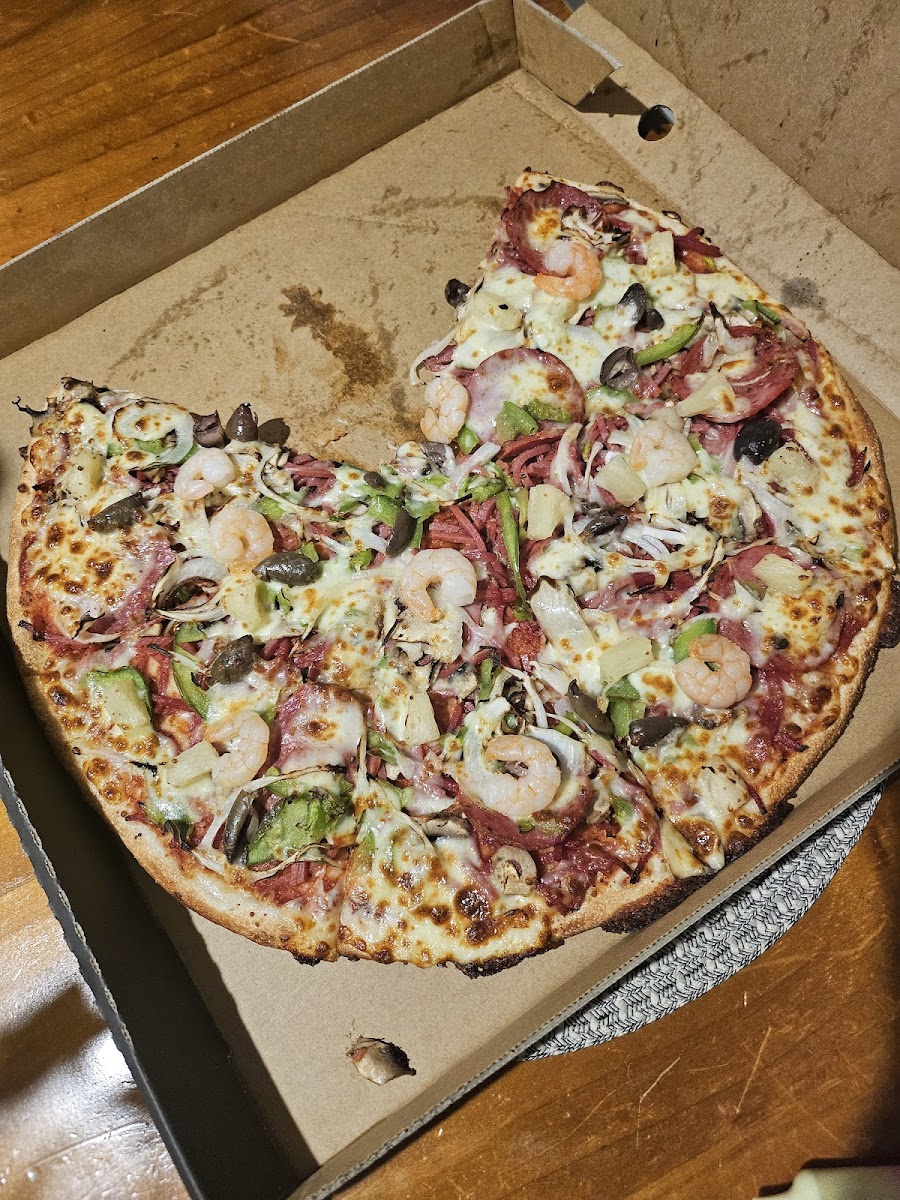 Ham, Hot Salami, Mushroom, Onion, Capsicum, Pineapple, Olives And Prawns